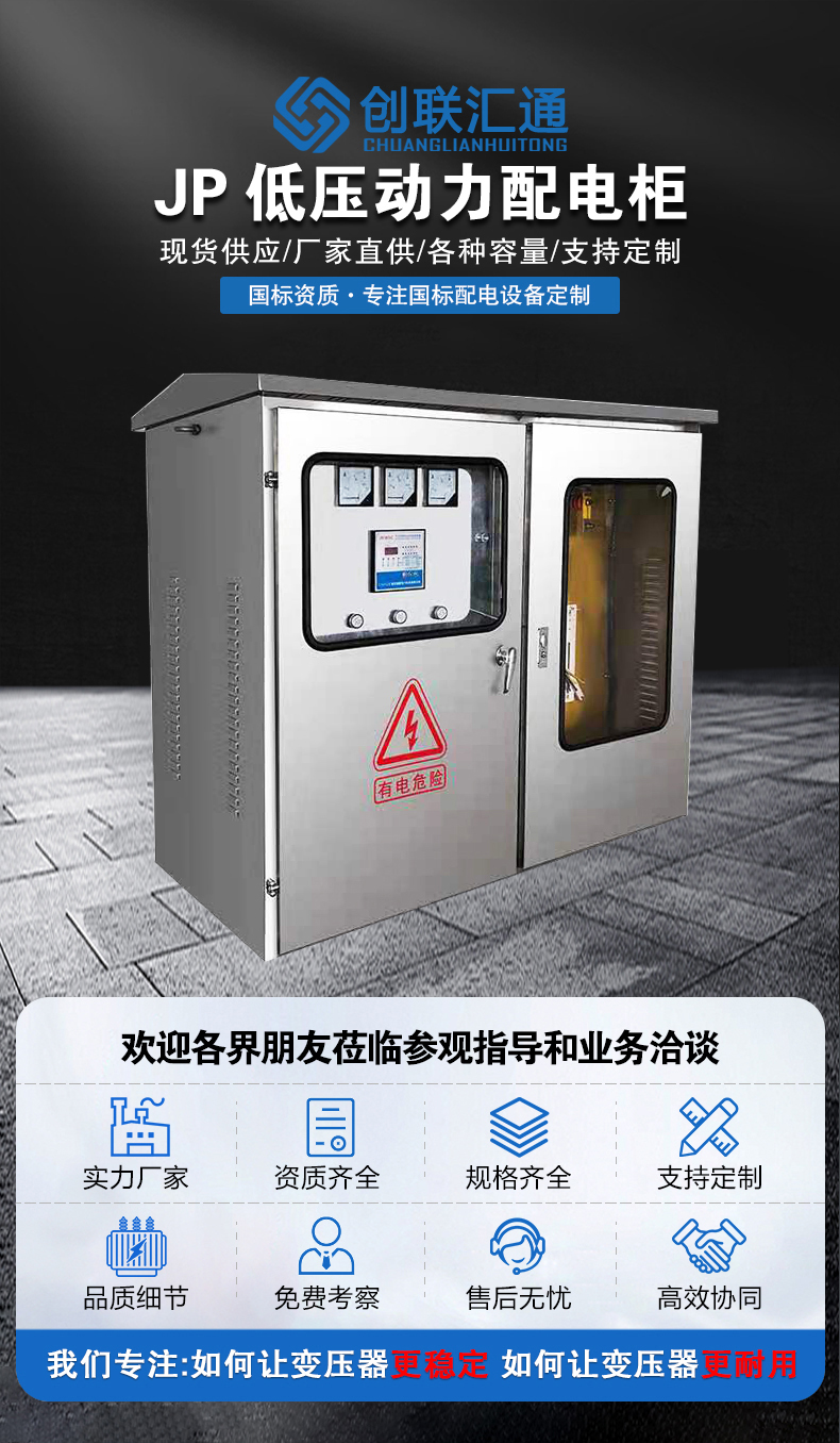 變壓器的綜合配電箱又稱為JP柜。戶外綜合配電箱是集計量、出線、無功補償等