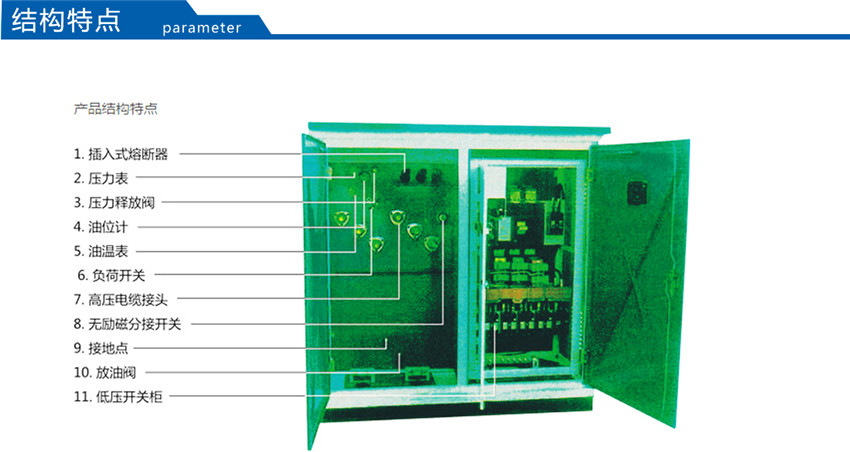 該產品將高壓負荷開關、高壓熔斷器置于變壓器油中,具有與變壓器器身共箱或分箱兩種結構形式。油箱采用全密封結構,配有油溫表、油位表、壓力表、壓力釋放閥、放油閥等元件以監測變壓器運行狀況。該產品分為環網型、終端型及電源型供電方式。為了使此種產品更適合于我電網的實際要求,公司又推了插拔型干式熔斷器,熔絲的熔斷不影響變壓器油的性能。根據低壓饋出要求的復雜程度,YBM-12/0.4型產品分為標準型、加強型和綜合型三種外殼形式,使用戶和設計單位在選型時,做到更靈活、更經濟。